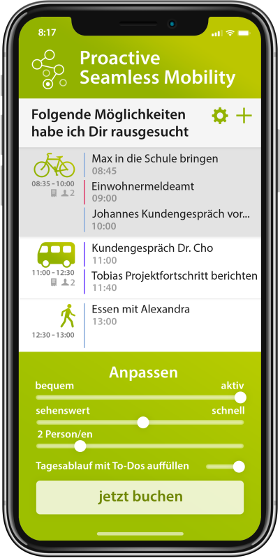 With us, local authorities share vehicles with citizens, senior citizens use public transport again thanks to mobility controllers, and electric vehicles drive more economically than combustion engines thanks to optimized capacity utilization.
